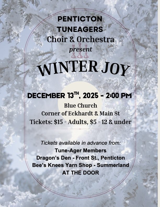 Embrace the warmth and wonder of the holiday season at Winter Joy, a Tune-Agers Christmas concert to take place at the Blue Church, on Main and Eckhardt on Saturday December 13 at 2.00pm. Tickets are $15 for adults and $5 for 12 and under available in advance from Tune-Ager members, Dragon's Den in Penticton and […]